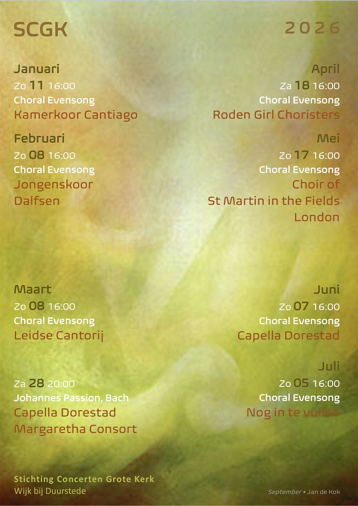 De Stichting Concerten Grote Kerk (SCGK) stelt zich sinds haar oprichting in 1977 ten doel om concerten en andere culturele activiteiten te organiseren in De Grote Kerk van Wijk bij Duurstede.